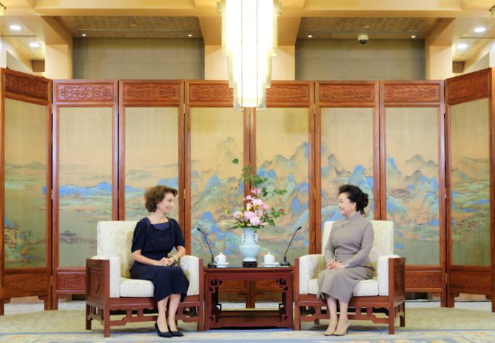 颁奖仪式前,彭丽媛会见阿祖莱,双方就促进全球女童和妇女教育事业发展交换了意见。会见后,彭丽媛和阿祖莱同历年获奖项目代表集体合影,并参观女童和妇女教育奖设立十周年获奖项目图片展。
