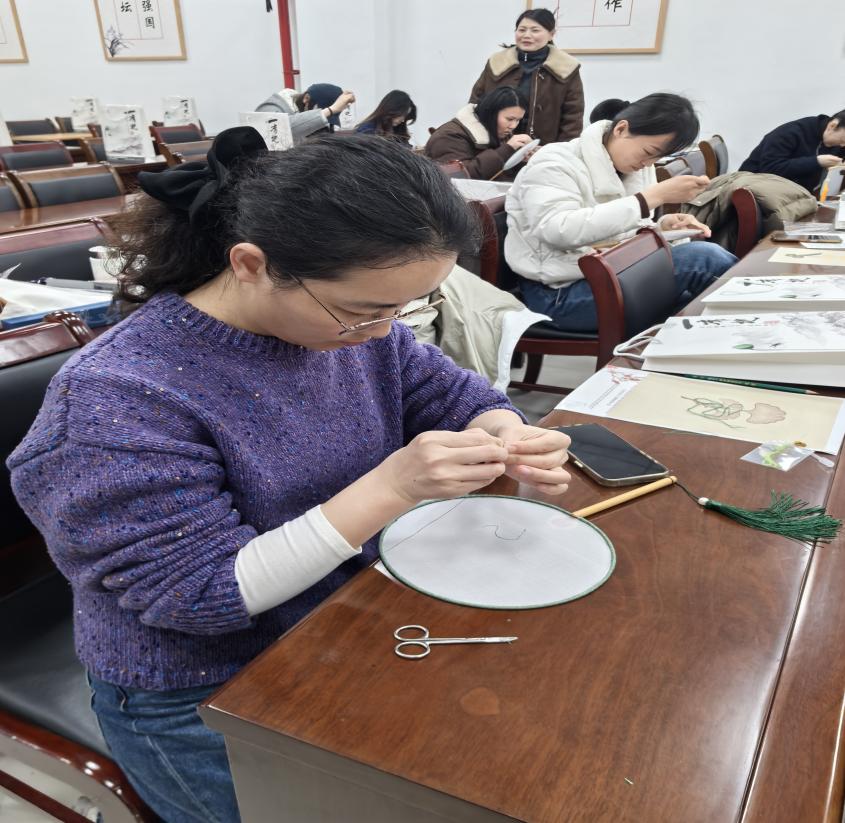 活动特邀高级工艺美术师、徐州市工艺美术大师、徐州汉绣非遗传承人席建勋老师亲临授课。席老师从汉绣历史、针法要领入题,进行了生动讲解与细致示范。女老师们在一针一线中静心体验,指尖流转,锦绣生辉,不仅领略了汉绣技艺的独特魅力,也在协作交流中度过了一段温馨美好的时光。